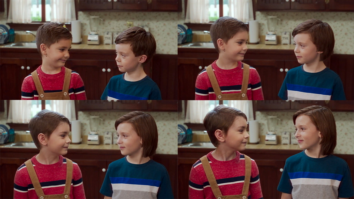 “The main hurdle in this process was needing to tackle the effect in layers. Because of hairstyle differences and differences in facial landmarks a number of things had to be painted out to make a clean canvas for introducing sections of the older kids faces.”