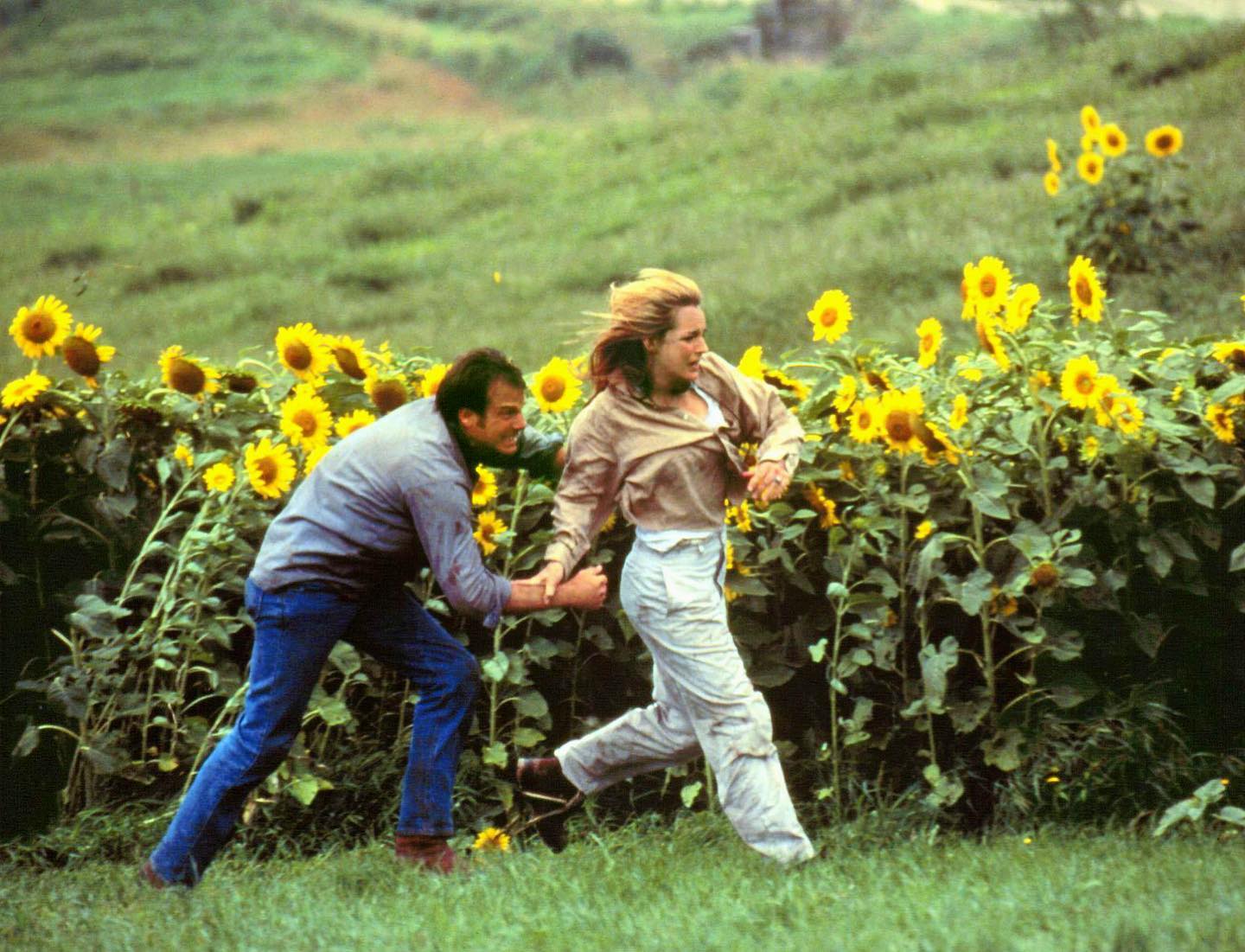 In the final climactic moments of Jan de Bont’s Twister–celebrating its 25th anniversary this week–the characters played by Helen Hunt and Bill Paxton dash away from a giant tornado about to sweep up a whole barn (and them). In doing so, they run past a field of sunflowers, specially planted for the scene.